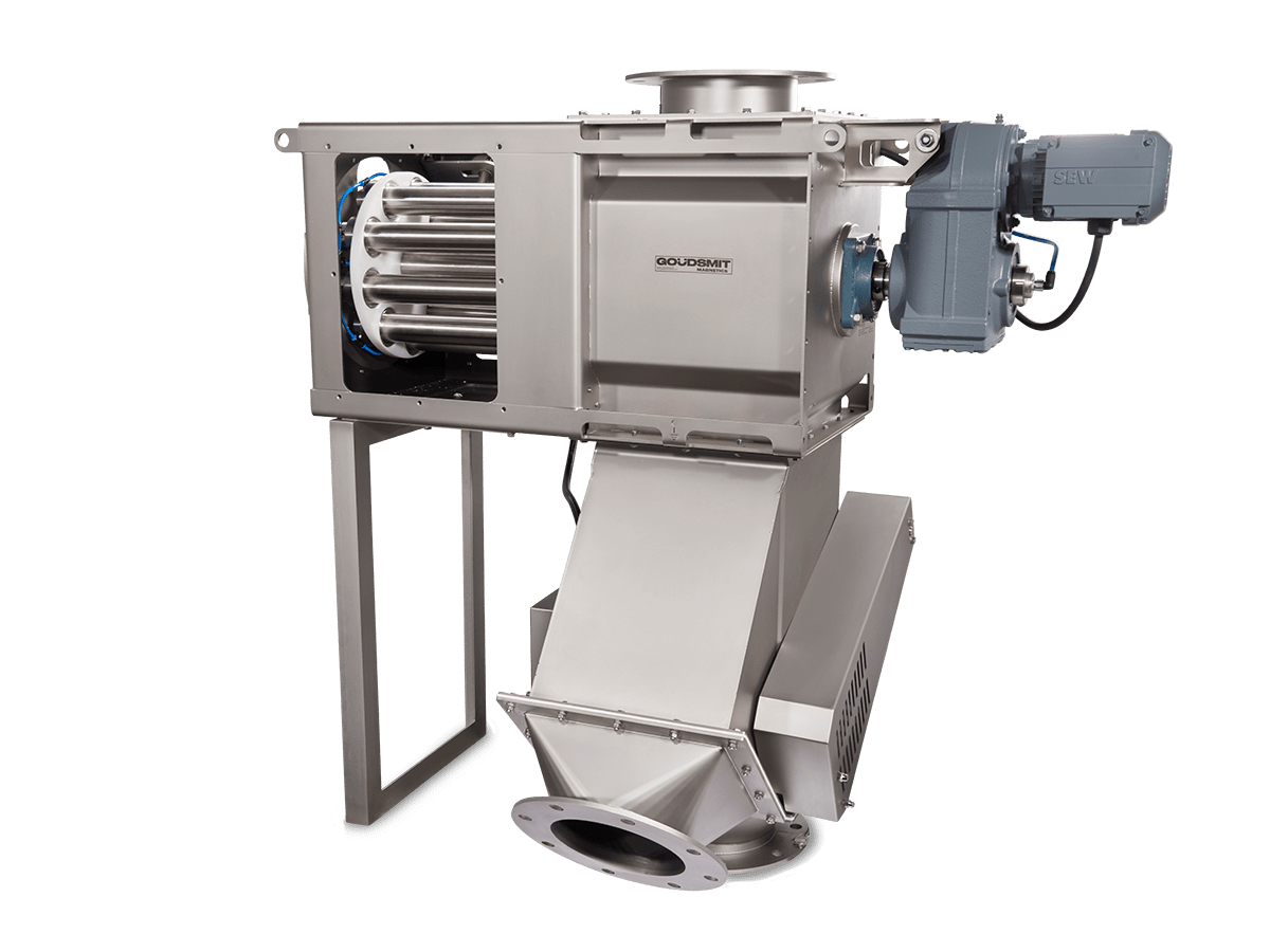 By rotating the magnetic bars, we prevent fine powders from sticking to the bars, so that contact with the magnetic bars remains optimal. This is important because the very small and often weakly magnetic particles have to hit the magnetic bars in order to be able to ‘catch’ them. Goudsmit’s magnetic separator for lithium contains nine large, extra strong magnetic bars. These pneumatically operated magnetic bars with a diameter of 50 mm have a deep holding field. With a flux density of 12,000 gauss on the bars, the magnet can capture paramagnetic particles in addition to iron particles.