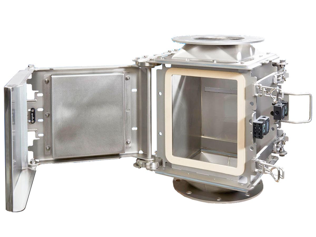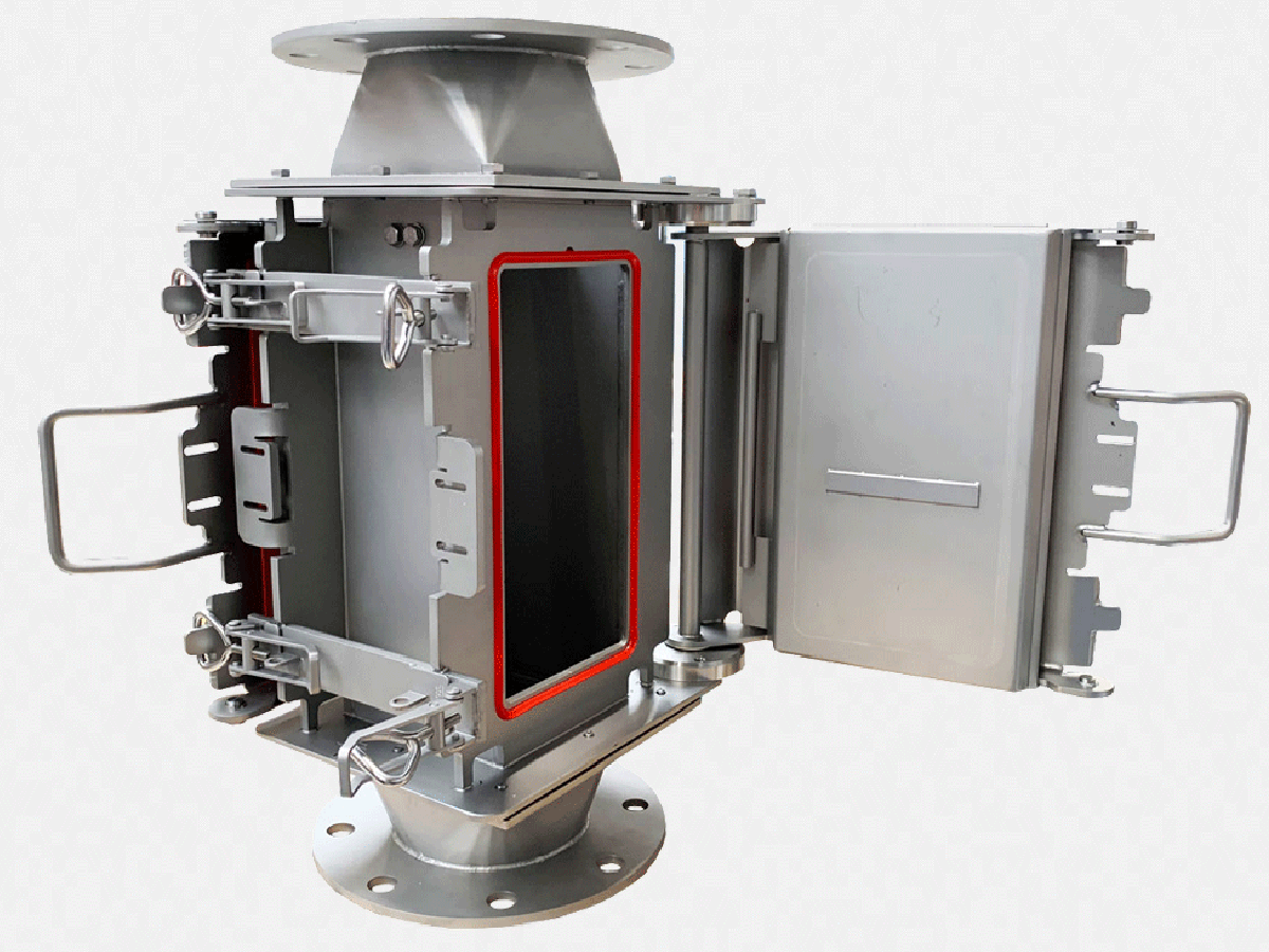 For filtering ferrous contaminants from coarse, free-falling, high-capacity pipelines. The magnet plates are placed outside the product channel to secure an unobstructed product flow. Cleaning is quick and easy, by means of a hinged extractor plate (quick-cleaning).