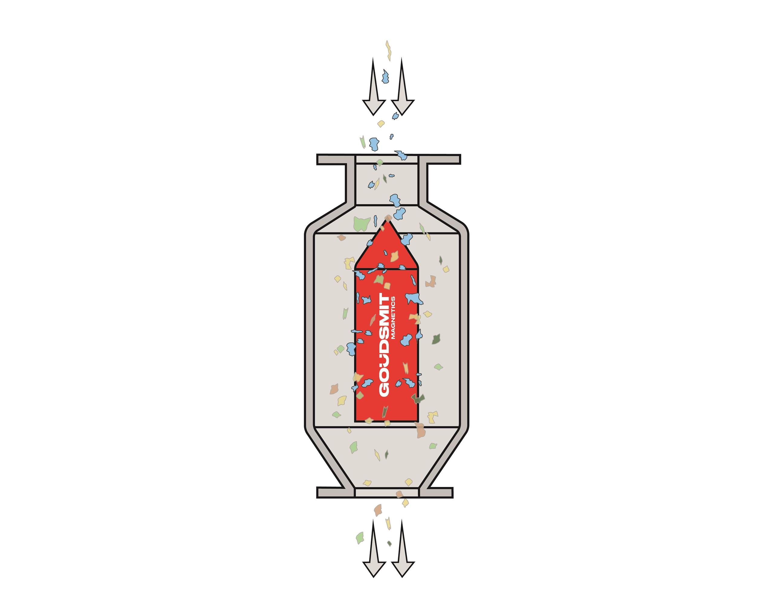 Permanent bullet magnets have a powerful bullet-shaped ferrite magnet core. They are suitable for filtering medium to large ferrous contaminants from high capacity coarse free-fall bulk flows. Often used in eg. the bulk, animal feed, plastics, ceramics and recycling industries. Permanent bullet magnets have a lower installation height compared to electro bullet magnets. Yet, you have to clean them manually, where this is done automatically with the electro bullet magnets.