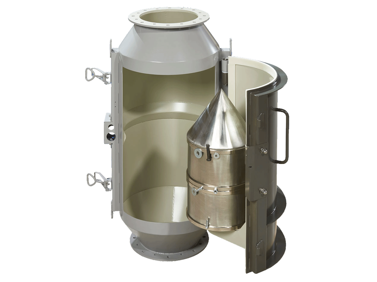 Because the magnetic core is located in the middle of the product stream, the bullet magnet has a very high separation yield. The round shape of the housing and the magnetic core (with a 60° top cone) ensures continuous flow and good distribution of the product stream.
