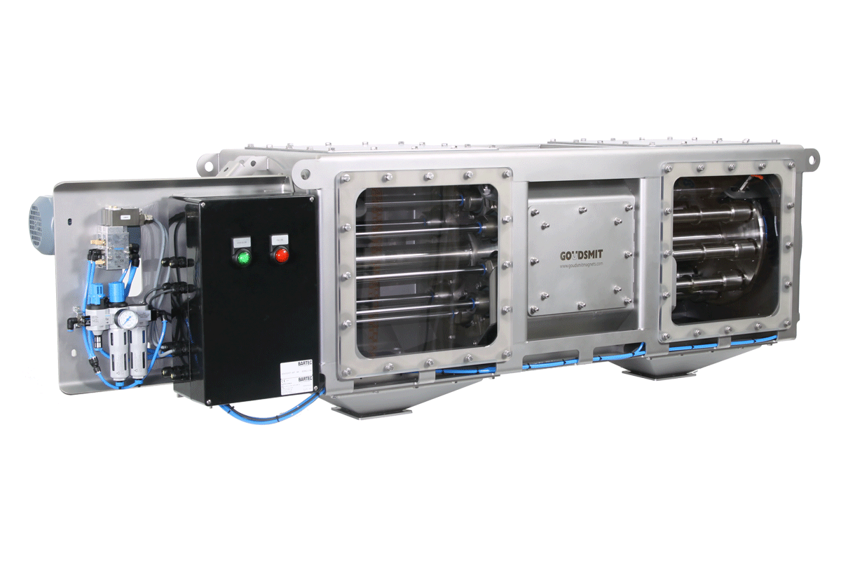 These automatic Cleanflow magnetic separators have a magnetic rotor. This rotor contains pneumatic magnetic bars, constructed of robust Ø34 mm SS tubes inside of which strong neodymium N42 magnet packages are moved by air pressure. The bars measure no less than 9400 gauss on the Ø34 mm tubes.