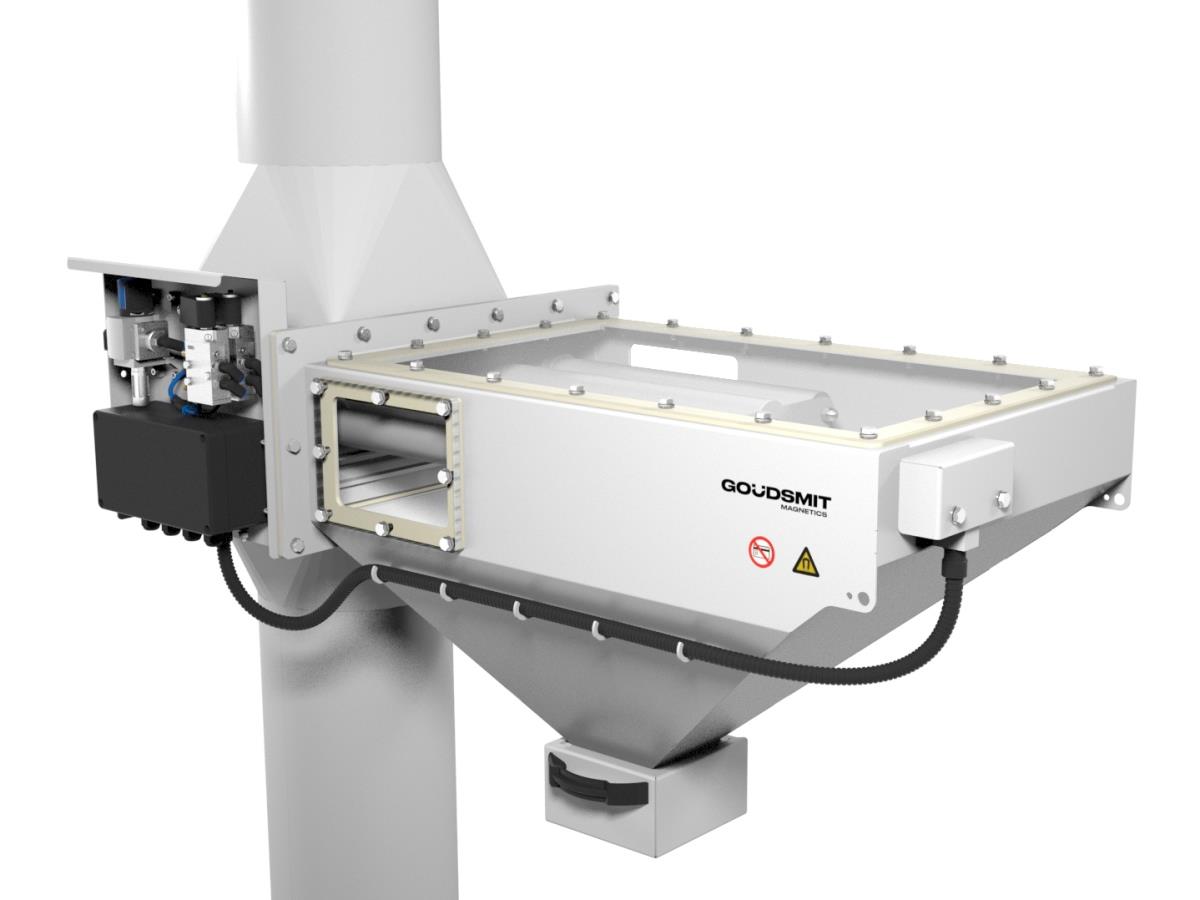 These new 'EasyClean' type Cleanflows are equipped with robust Ø50 mm magnetic bars, that measure no less than 12,000 gauss at the contact surface of the bars. Suitable for magnetic filtering of small amounts of ferrous and even weakly-magnetic contaminants from high-capacity granulate and powder flows in free-fall and low-pressure transport pipes up to 0.5 bar. The automatic cleaning makes this separator suitable for situations where the magnetic separator is hardly or not accessible for operation and cleaning.