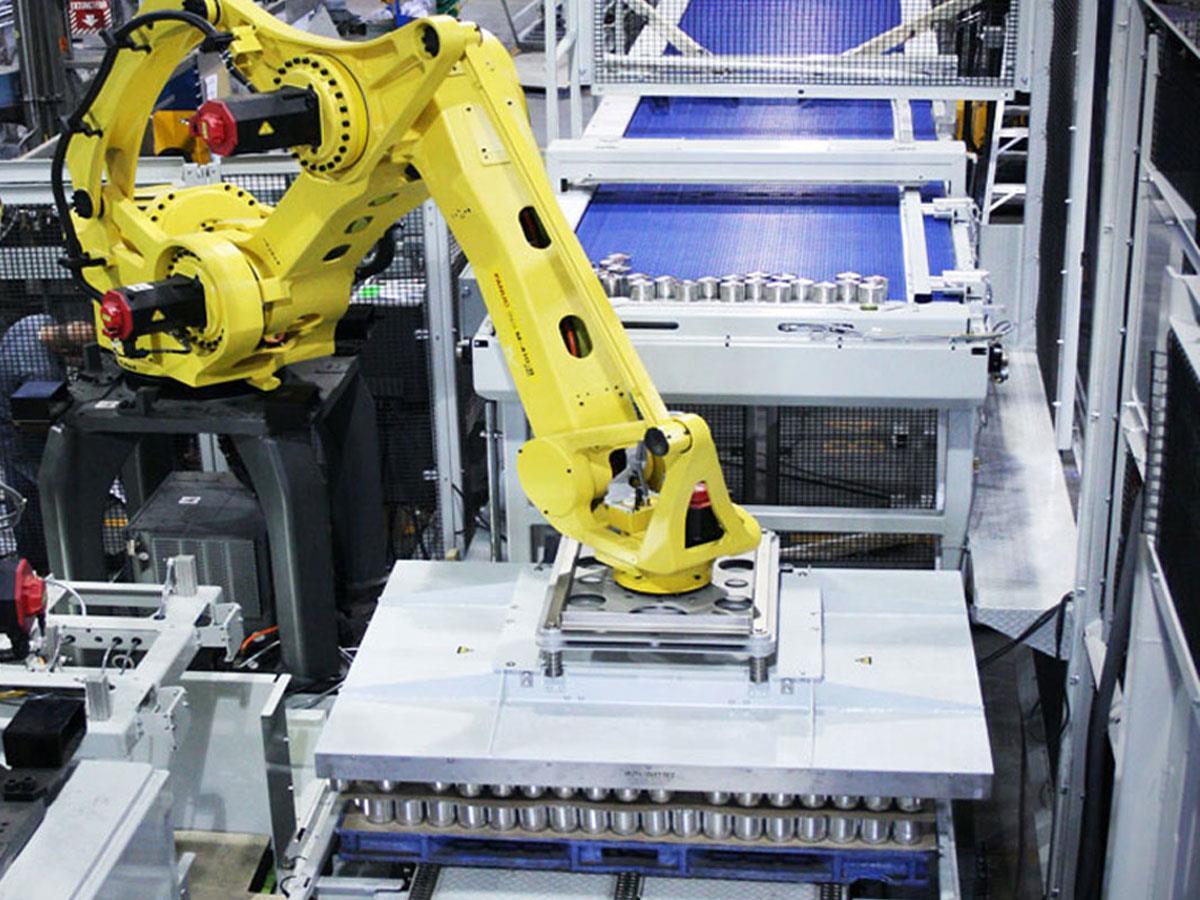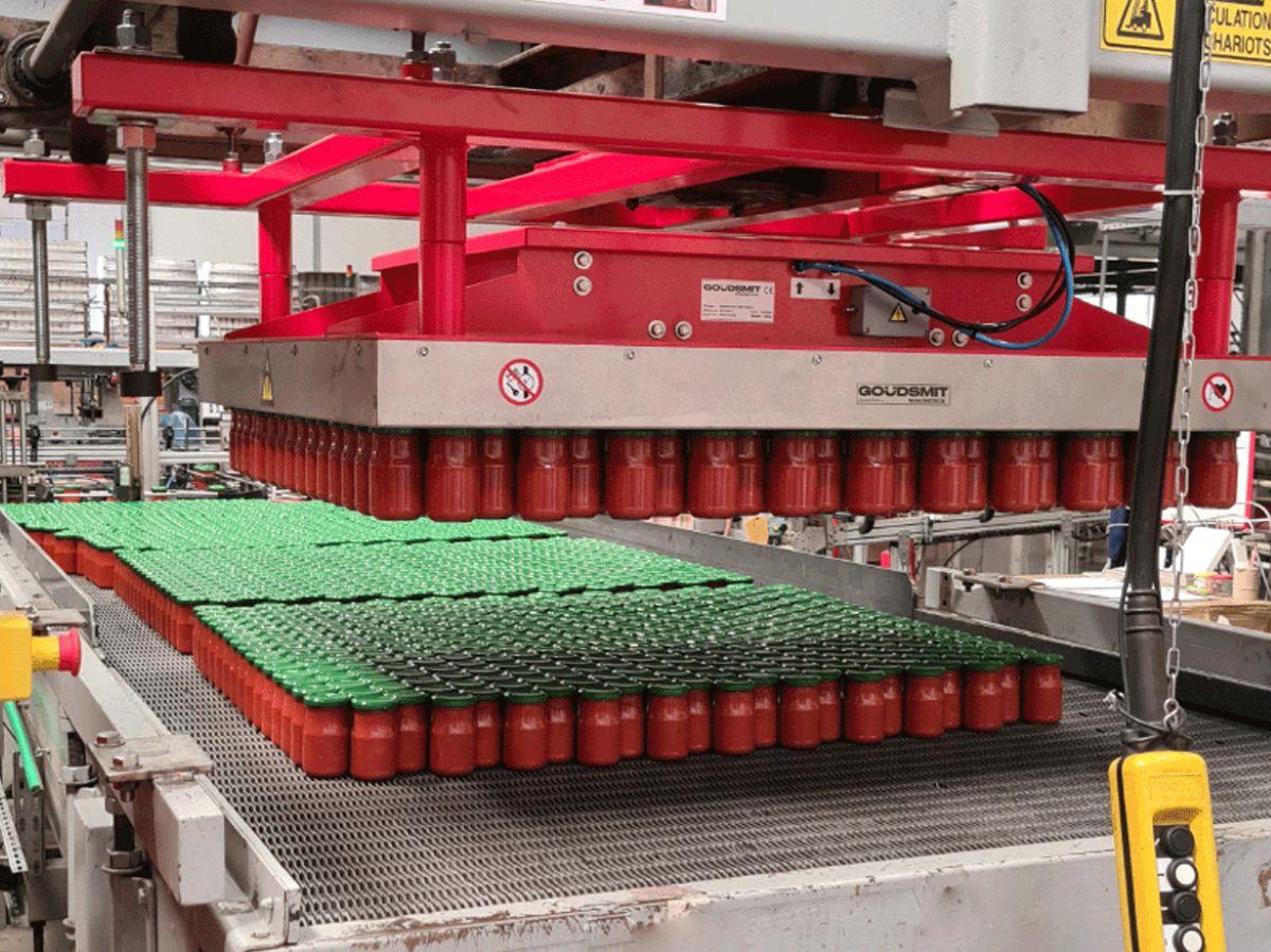 For palletizing/depalletizing extra-large filled tins and filled jars with screw lids.
