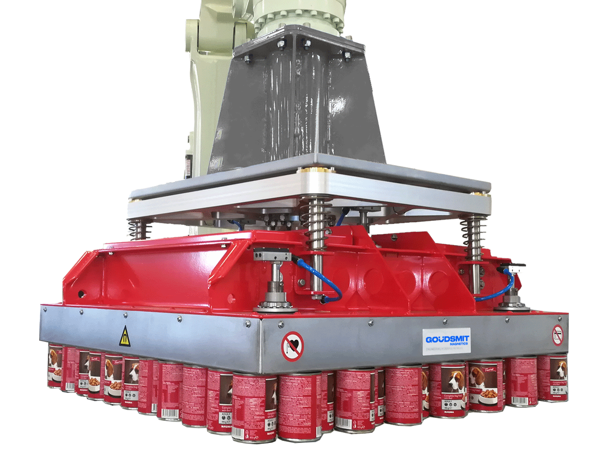 With palletization magnets, you pack tins, aerosols, cans and glass jars with steel lids in one go. The magnet holds a layer of products without an energy supply. They are suitable for attachment to a robot arm or gantry crane (palletizing machines) and help with packing and unpacking in automated processes.