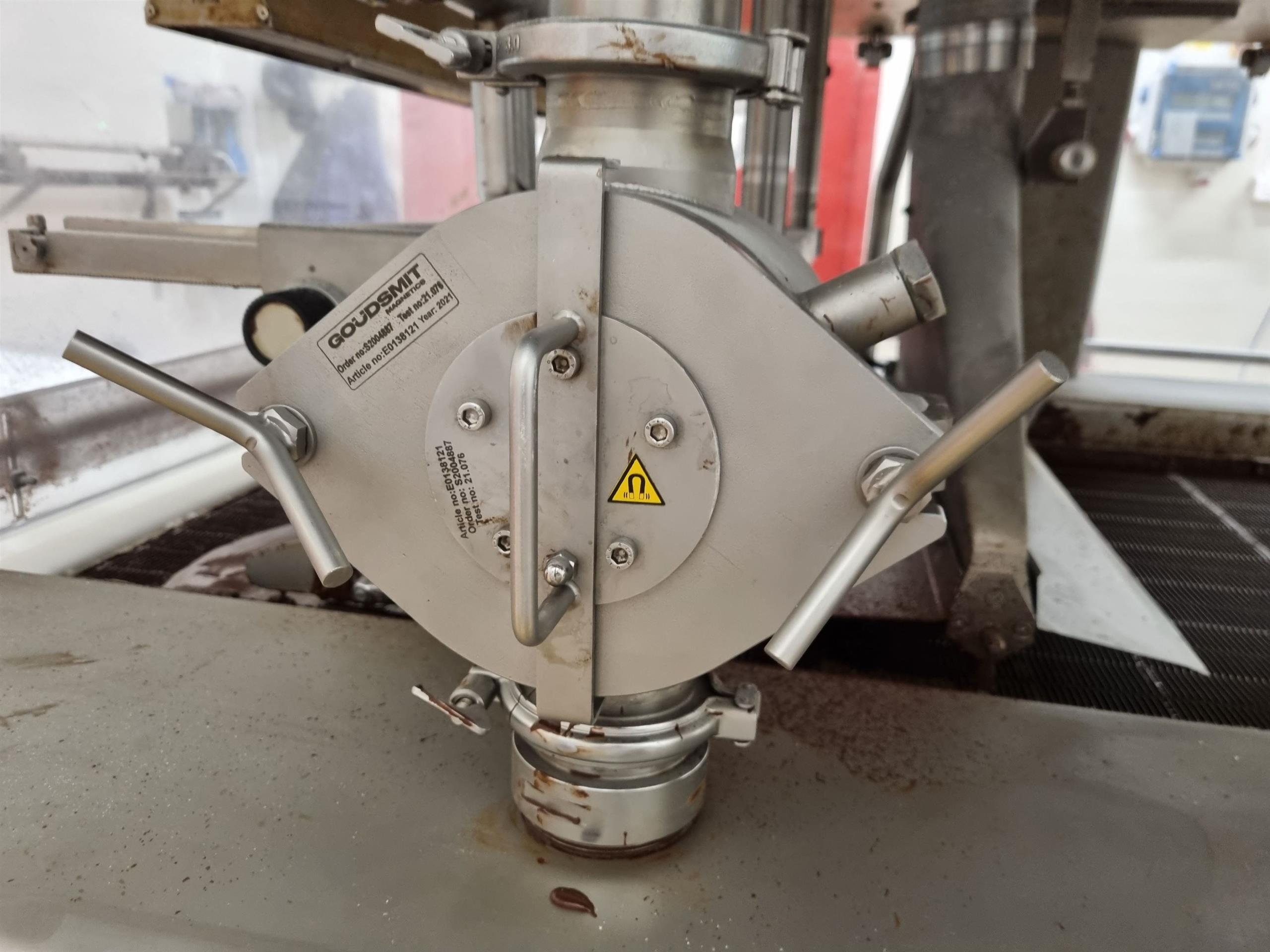 Once the product flow is stopped, you take the entire magnetic grid unit out of the product channel. Then pull the magnetic bars out of the extractor tubes, causing the ferrous particles to fall off the extractor tubes. For larger passages, the cleaning is done by manually sliding the magnet unit out over guides, because these magnet units are too heavy to lift.