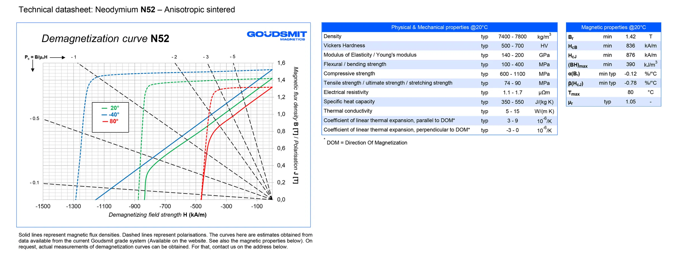 We distinguish different types of magnet materials, each with its own rating (grade) and therefore Max. energy product: