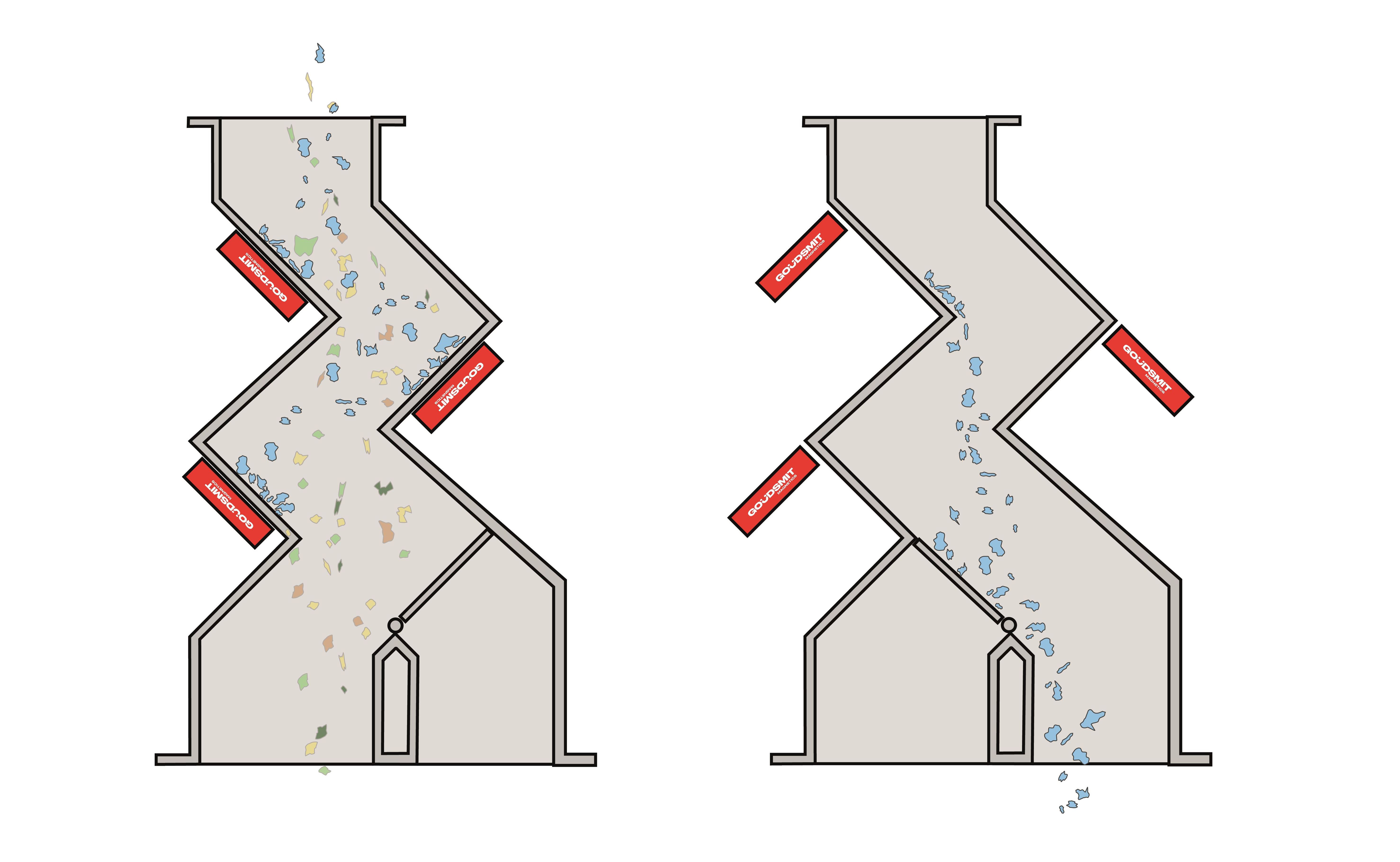 Solidna obudowa w kształcie kaskadowym wymusza bliskie przechodzenie produktu przy 3 płytach magnetycznych. Ponieważ są one umieszczone poza kanałem produktu, kanał rurowy nie jest blokowany. W ten sposób można przetwarzać duże ilości produktu i osiągnąć wysoką wydajność separacji. Magnesy kaskadowe filtrują zanieczyszczenia żelazne o wielkości od 0,5 do 50 mm od przepływów grubych produktów ze swobodnym spadkiem i są czyszczone automatycznie. Przykłady zastosowań: luźne pasze dla zwierząt, tworzywa sztuczne, ceramika i recykling.