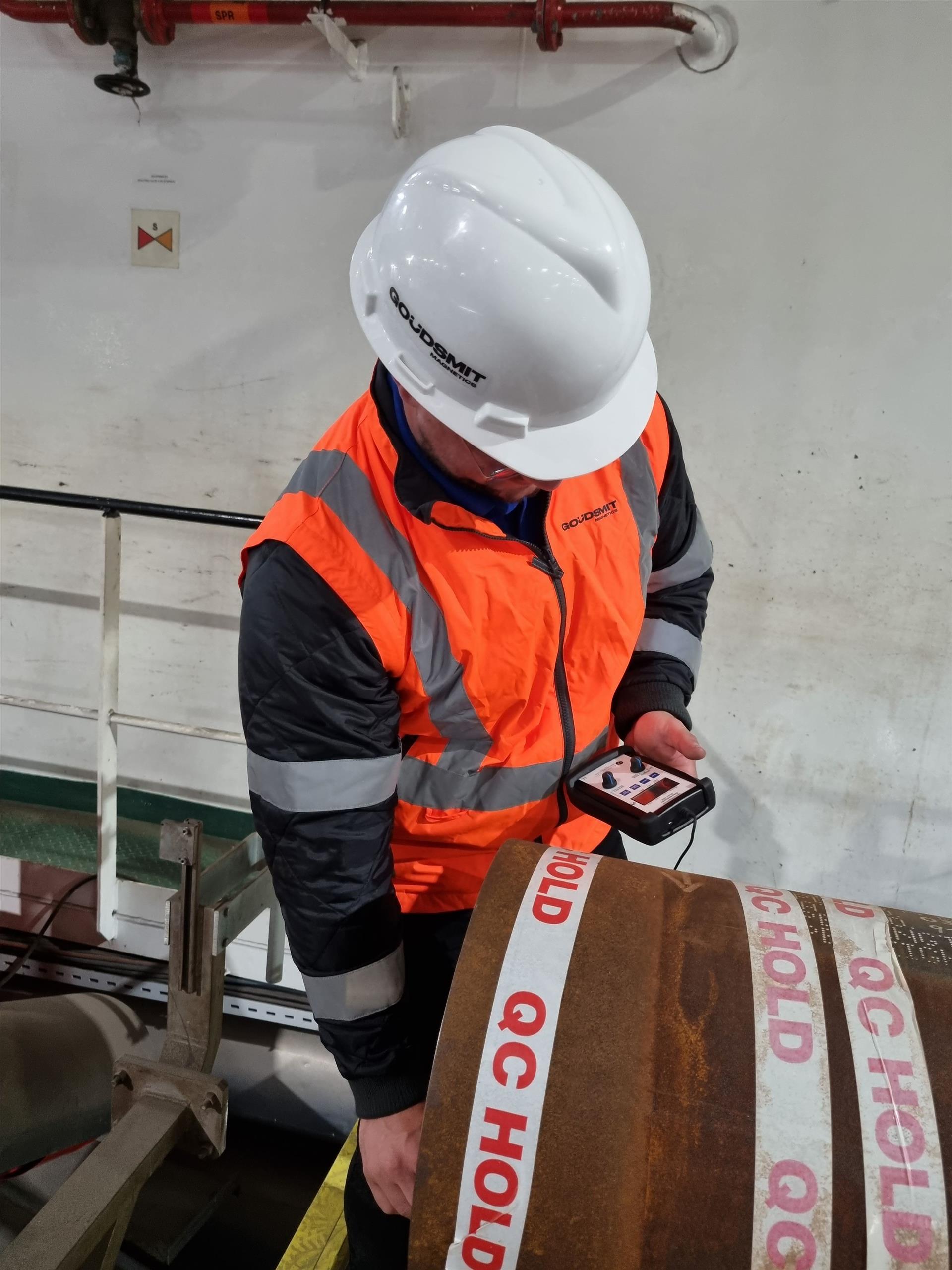 Um Rohrleitungen zu verlegen, schweißt eine Fabrik an Bord Rohrstücke zusammen, die auf den Meeresboden abgesenkt werden. Während des Schweißvorgangs dachten die Ingenieure von Pioneering Spirit an eine Möglichkeit zur Verbesserung des Schweißvorgangs und zogen Goudsmit Magnetics hinzu. Fast alle Eisenmetalle können einen Restmagnetismus enthalten, so auch einige der Rohrsegmente in der Pioneering Spirit, die sich nicht so einfach zusammenschweißen ließen. Der Grund dafür ist, dass der Lichtbogen Elektronen enthält, die ihn aufgrund des Magnetfeldes ablenken. Infolgedessen besteht die Gefahr einer minderwertigen Schweißnaht, die die strengen Qualitätskontrollen nicht bestehen könnte. Zwei unserer Ingenieure reisten zur Maasvlakte, um zu untersuchen, ob die Verbesserung im Prozess umgesetzt werden kann. Sie nahmen ein Gaussmeter und eine Reihe von Entmagnetisierungssystemen mit, darunter einen Entmagnetisiertunnel und eine mobile Entmagnetisierungseinheit.
