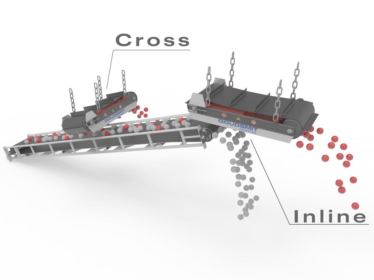 Der Abstand zwischen Magnet und Förderband muss so klein wie möglich sein. Die Magnetkraft verringert sich exponentiell mit zunehmendem Abstand. Es ist jedoch ein Mindestabstand erforderlich, damit die Gummileisten alle angezogenen Ferro-Teile sicher aus dem Materialstrom entfernen. Es bestehen zwei Methoden für die Nutzung/den Einbau von Überbandmagneten: Quer oder in Laufrichtung. Goudsmit verfügt für beide Aufstellungsmöglichkeiten über eine spezifische, optimale Magnetkonfiguration.