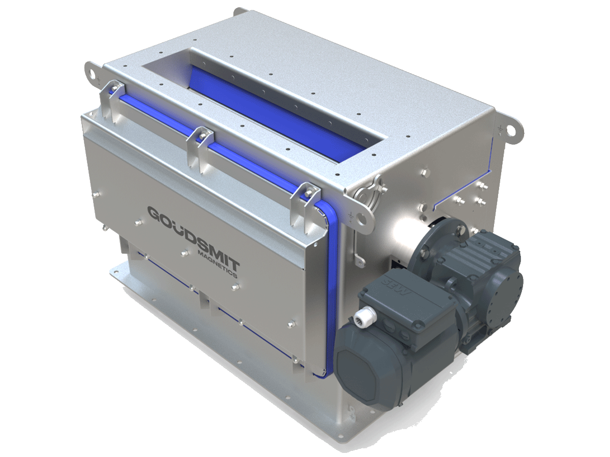 We have recently developed a new series of magnetic drum separators especially for the intake of foodstuffs. These magnets remove ferrous particles and weakly magnetic particles as small as 0.03 mm from free-falling granular products in the said industry. The ever-increasing demands on magnetic force and material certifications have led to this modified design.
