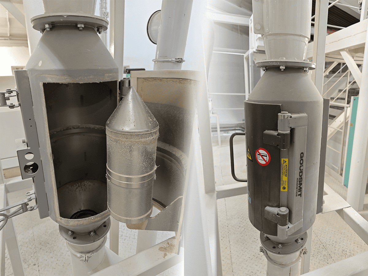 Permanent bullet magnets have a powerful bullet-shaped ferrite magnet core. They are suitable for filtering medium to large ferrous contaminants from high capacity coarse free-fall bulk flows. Often used in eg. the bulk, animal feed, plastics, ceramics and recycling industries. Permanent bullet magnets have a lower installation height compared to electro bullet magnets. Yet, you have to clean them manually, where this is done automatically with the electro bullet magnets.