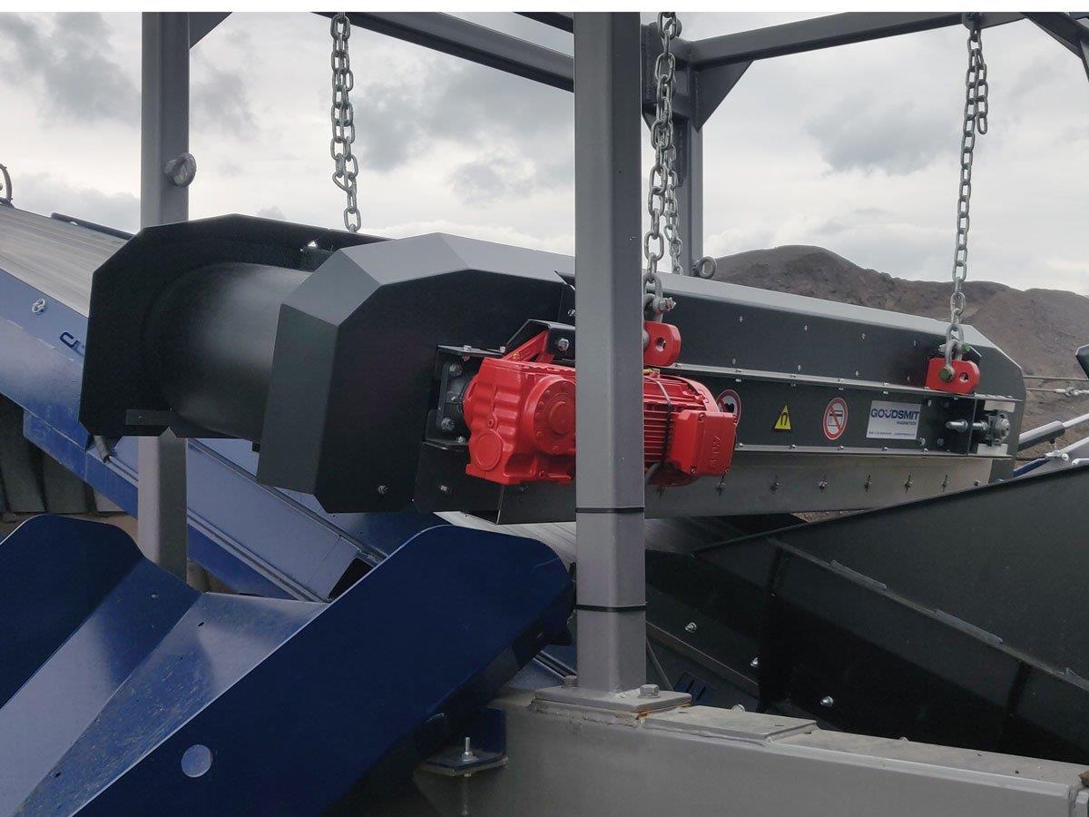 Goudsmit ha desarrollado recientemente una gama de imanes de banda superior móviles. Los imanes de diseño modular eliminan las partículas de hierro de los flujos de material subyacente y están destinados a sistemas de reciclaje móviles como trituradoras, machacadoras y cribas. Los separadores magnéticos se construyen con imanes de ferrita o de neodimio, y estos últimos se mejoran pasando de un sistema de 2 polos a uno de 3 polos. Este diseño modificado proporciona un campo magnético más potente con el mismo número de imanes. La compacta y fuerte sobrebanda de 3 polos de Neodimio permite que el hierro gire más y tira de él para soltarlo, incluso cuando está debajo de una pila de material. Así es como funciona el imán overband modular.