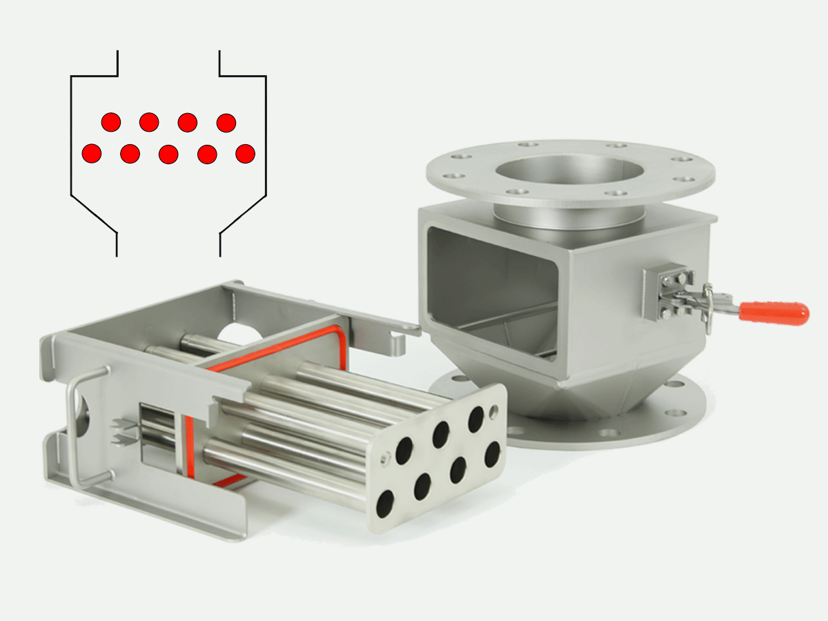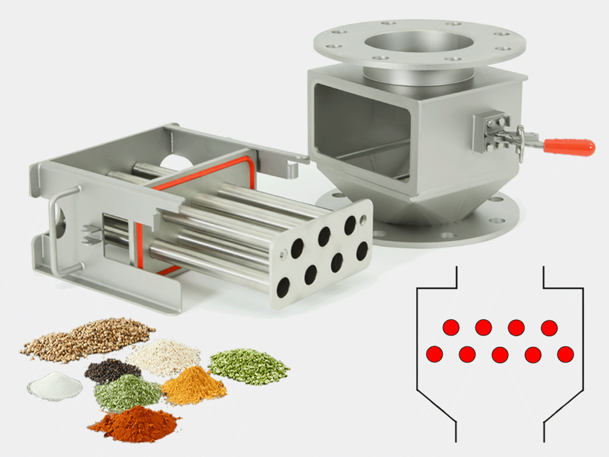 De magneetroosters met zeer sterke neodymium magneetstaven zitten middenin de productstroom. Het met ferrodeeltjes verontreinigde product passeert altijd 2 magneetstaven tijdens het stromen door de scheider. De magneten trekken passerende ferrodeeltjes aan. De gevangen deeltjes blijven aan de magneten kleven, terwijl het gezuiverde product verder stroomt.