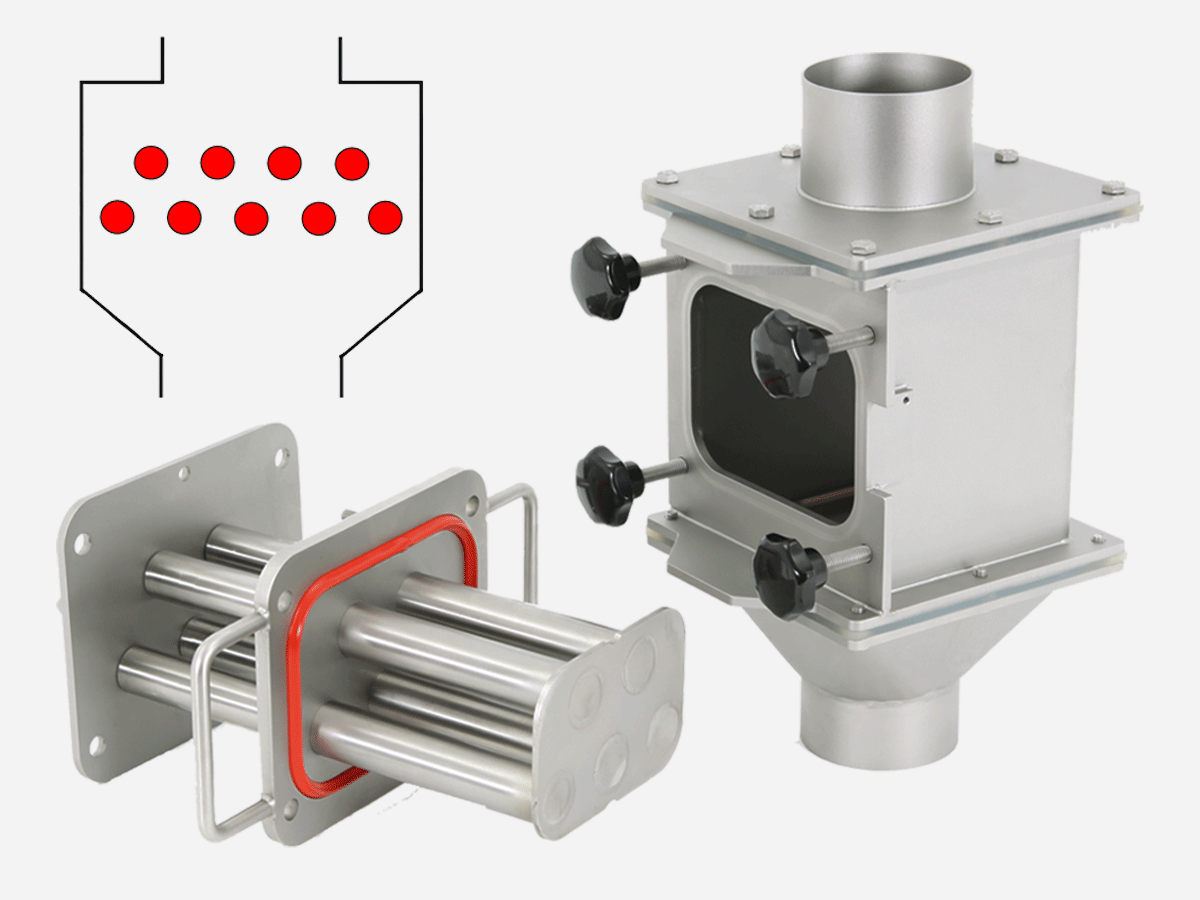 Voor het magnetisch filteren van kleine hoeveelheden, fijne ferro-verontreinigingen uit granulaten en droge, goed stromende poeders in vrije val-transportleidingen. Industriële en hygiënische uitvoeringen beschikbaar.