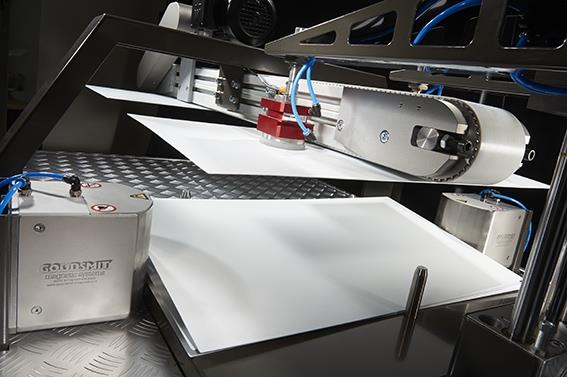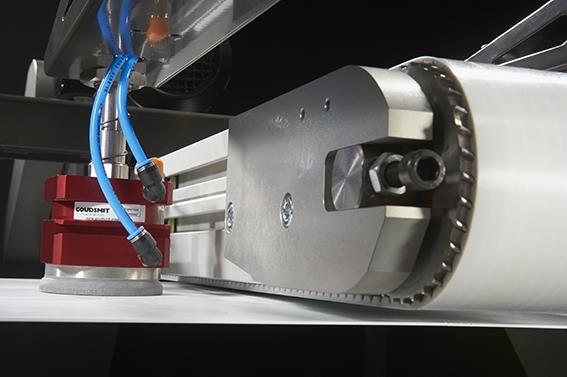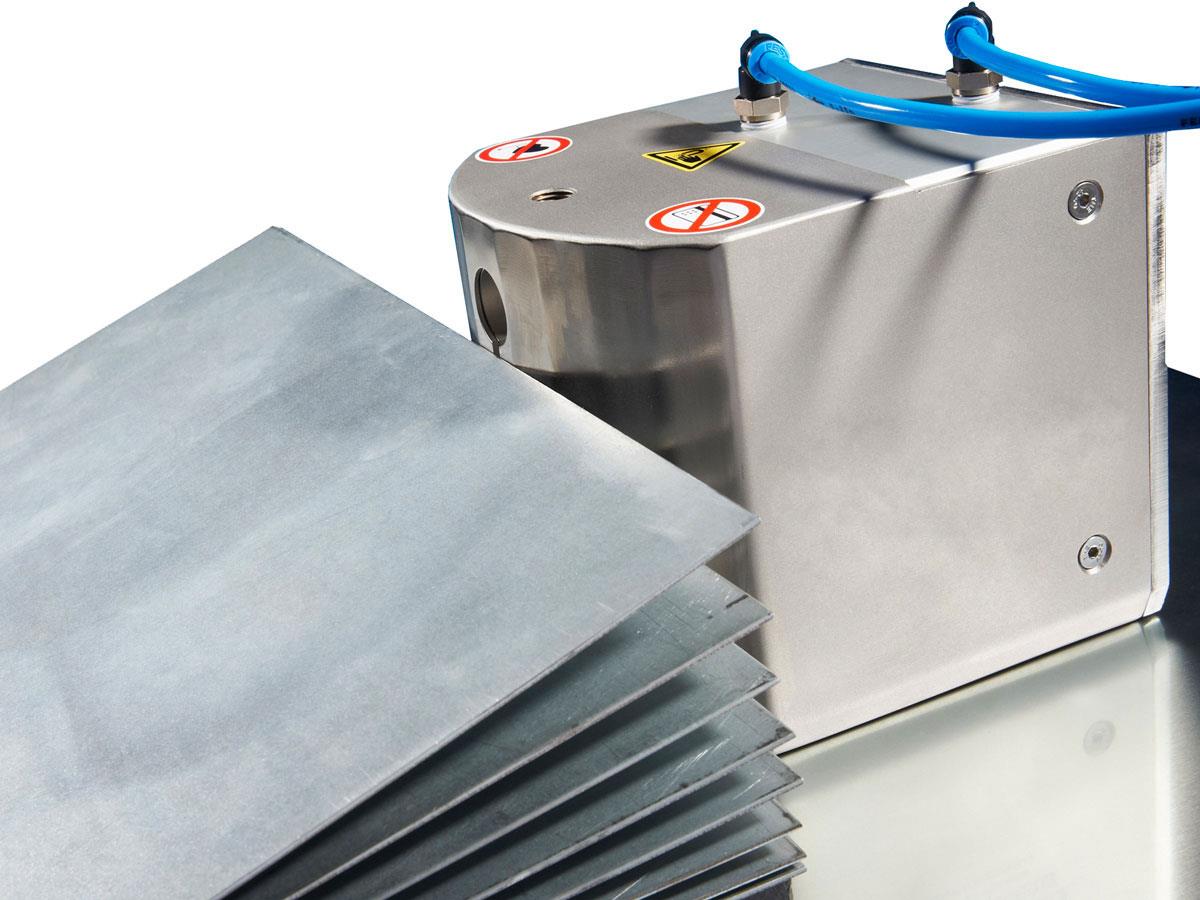 Przenośnik nadaje się do blach o grubości 0,7–2,5 mm. Aby uniknąć jednoczesnego pobierania dwóch blach, system jest wyposażony w dwa kompaktowe separatory płyt, przełączane pneumatycznie. Chwytaki magnetyczne, wyposażone w podkładkę cierną, przenoszą blachy bez ich uszkadzania i w razie potrzeby zapewniają wystarczające tarcie.