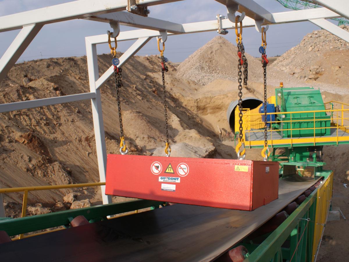 Magnes blokowy jest zawieszany nad taśmą transportową na łańcuchach lub kablach. Integracja tych separatorów może znacząco poprawić wydajność separacji: